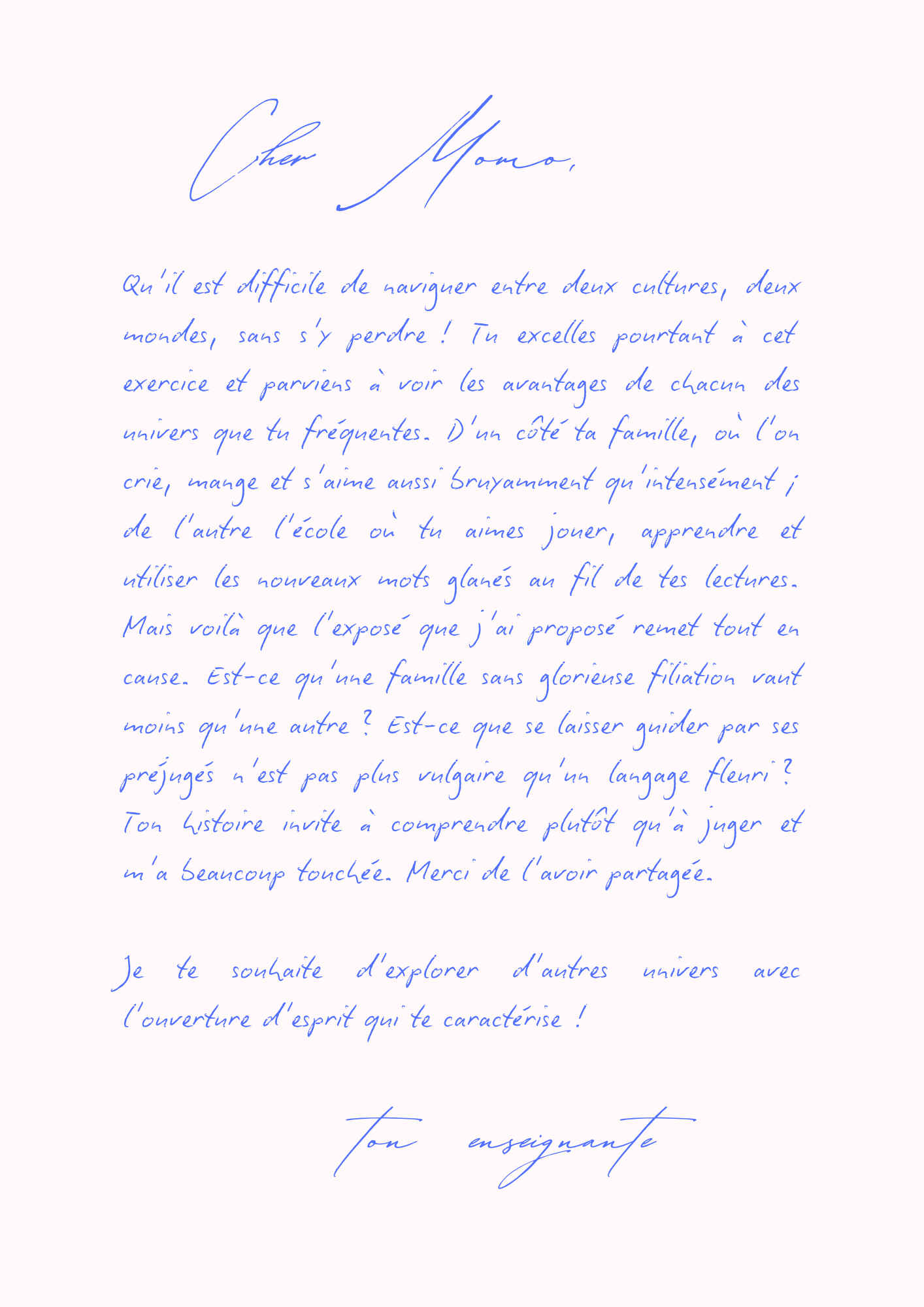 « Lorsque je reviens chez moi, je suis heureuse comme peut l’être une adolescente de mon âge à l’idée de revoir ma famille. Mais les miens ont la mine grave : « Mon retour ne se déroule pas vraiment comme je l’avais imaginé. Après la lecture du carnet, ma mère me félicite pour mon bon comportement général. Rien sur mes résultats. Je comprends que cela ne compte pas, que cela ne compte plus, et cette nouvelle indifférente m’effraie autant qu’elle me révolte. »