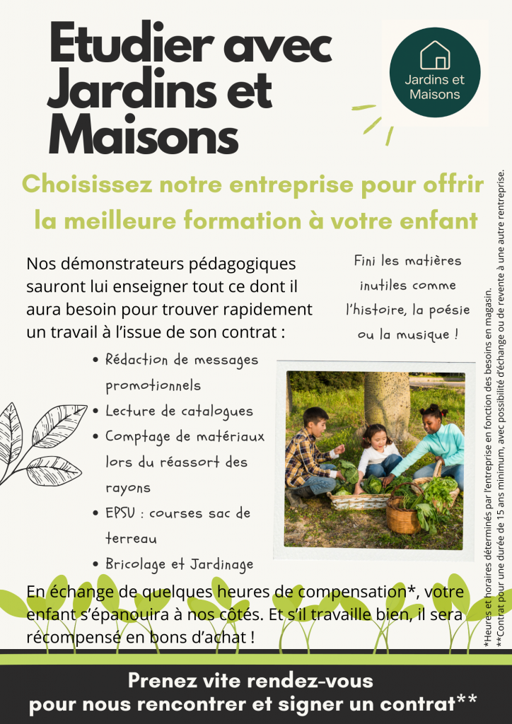 Comme Yves Grevet, Lucie est enseignante et se pose régulièrement des questions sur l’avenir de l’école. Elle a retrouvé nombre de ses préoccupations dans L’école est finie, court roman d’anticipation et de politique-fiction. En 2028 (demain !), une grande crise a détruit le système scolaire français. Il est maintenant sponsorisé par des entreprises qui forment les enfants aux métiers qui leurs sont nécessaires. Elle a imaginé le flyer de la structure dans laquelle le héros « étudie ».