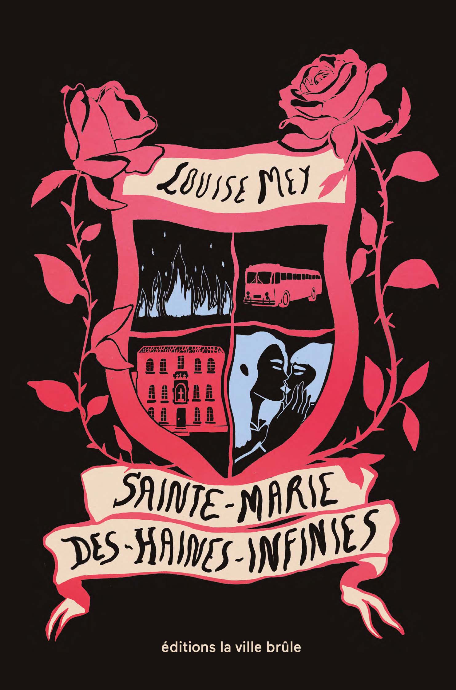 L’écriture et les thème de ce roman sont un peu crus : vocabulaire, sexualité, l’héroïne ne mâche pas ses mots, prenant d’ailleurs un malin plaisir à renommer son établissement en « Sainte-Marie-de-mon-Cul », « Sainte-Marie-des-Filles-Sages », « Sainte-Marie-des-Faux-Semblants ». On retrouve cette colère et cette hâte que l’année se termine enfin dans le style : la ponctuation est rare, les phrases très longues, comme si la narratrice n’avait pas le temps de reprendre son souffle tant elle a à dire. Cette écriture est déroutante mais cohérente avec le propos, tout comme la couverture qui reprend la figure du blason, qui rappelle la noblesse en y incrustant la figure de deux femmes qui s’embrasent, le thème récurrent du feu symbolisant la colère…